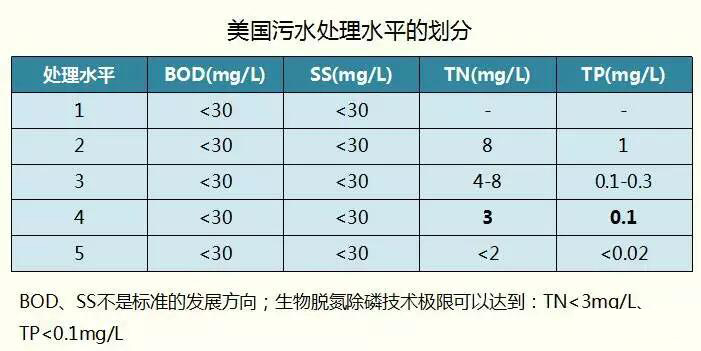 這是美國污水處理的水平分級,各級的BOD、SS沒變,只有氮磷在變。